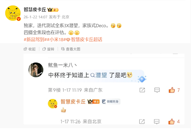 快科技1月22日音信,据博主“灵敏皮卡丘”爆料,小米18系列测试了全系3X潜望长焦,依然连续家眷式Deco想象。