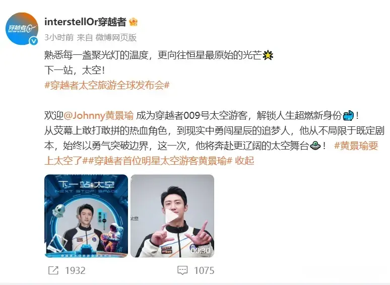 幸运彩app 演员黄景瑜将上天外!乘坐国内首艘交易载东谈主飞船,预售船票300万/张,展望2028年首飞